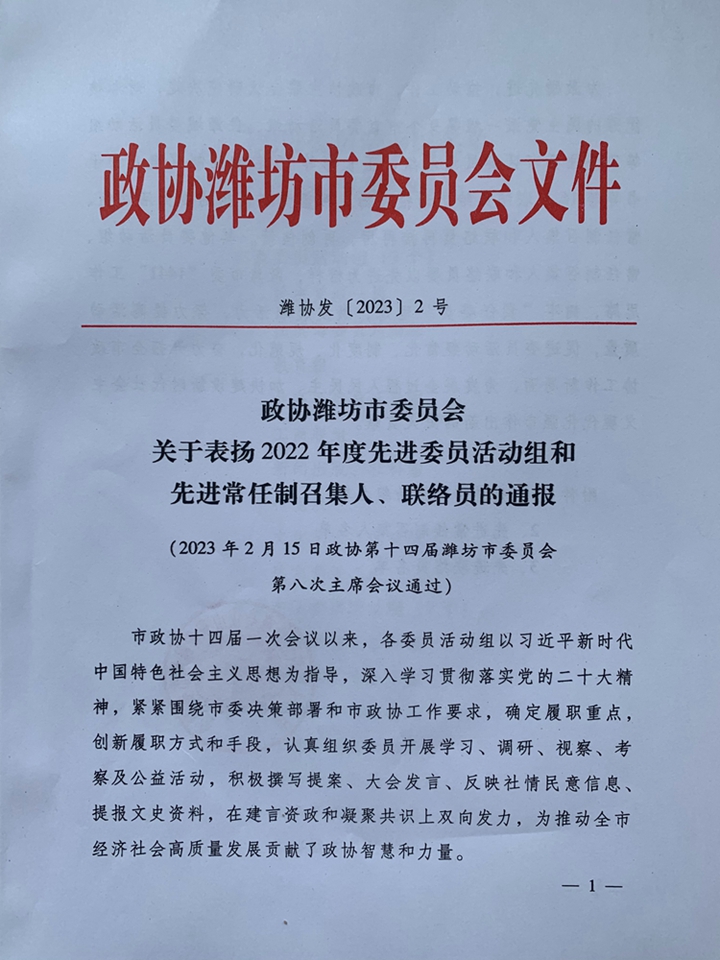 本网讯 为激励先进,推动工作,近日,政协潍坊市委会对2022年度15个先进委员活动组和16名先进常任召集人、16名先进联络员进行通报表扬(潍协发〔2023〕2号)。