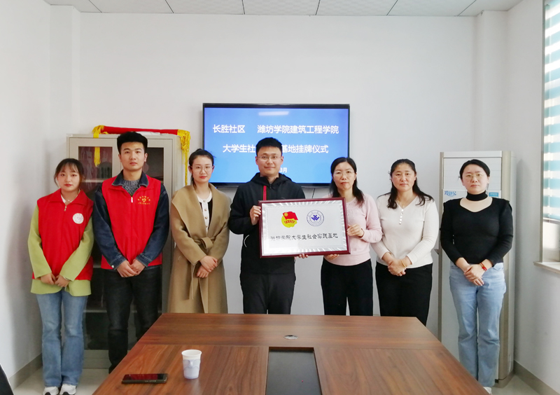 本网讯 为积极落实大学生社区实践计划相关要求,3月10日,建筑工程学院与潍城区长胜社区共同建立大学生社会实践基地揭牌仪式在长胜社区党群服务中心举行。长胜社区党支部书记马忠欣、党支部副书记丁峰、居委会副主任栾雪雁,建工学院团总支负责人等出席揭牌仪式。