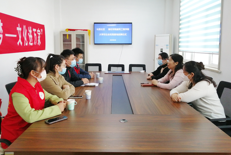 长胜社区书记马忠欣详细介绍了社区人居情况、志愿活动开展情况,他希望进一步加强与建筑工程学院的合作,努力推动社区教育内涵式发展。建工学院团总支负责人对长胜社区一直以来对该院共青团工作的大力支持表示感谢,希望今后通过大学生社区实践计划等方面加强交流与合作,培养学生的实践能力和综合素质。双方共同为潍坊学院大学生社会实践基地挂牌。