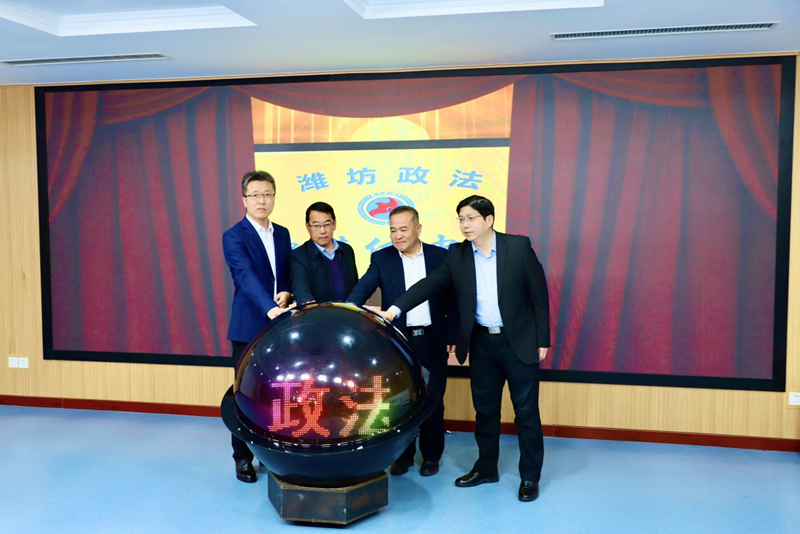 仪式上观看了潍坊政法融媒体中心介绍片;马向东、单振涛、田义明、牟朋飞共同为潍坊政法融媒体中心揭牌;传媒学院负责同志代表学校与市委政法委签订了大学生就业实习基地建设合作协议并为其授牌。