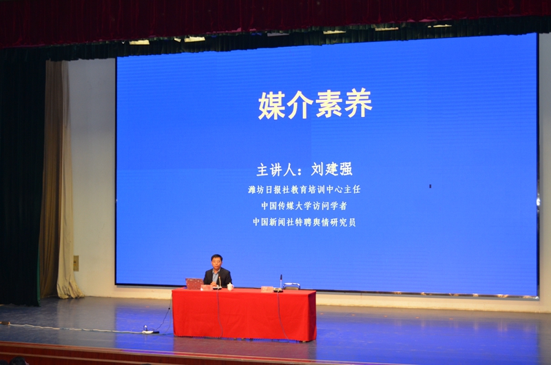 本网讯 为进一步提升新闻宣传工作队伍的政治素养和业务能力,提高新闻宣传工作水平,3月23日,学校举行新闻宣传能力提升专题报告会,邀请潍坊日报社教育培训中心主任刘建强作报告。
