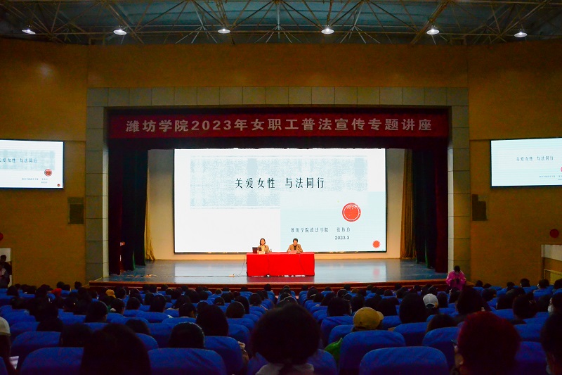 本网讯 3月30日下午,学校工会主办、政法学院承办的女教职工普法知识宣传月专题讲座在图书馆报告厅举行,政法学院张玮玲副教授给女教工代表做了《关爱女性,与法同行》专题讲座,受到老师们的热烈欢迎。