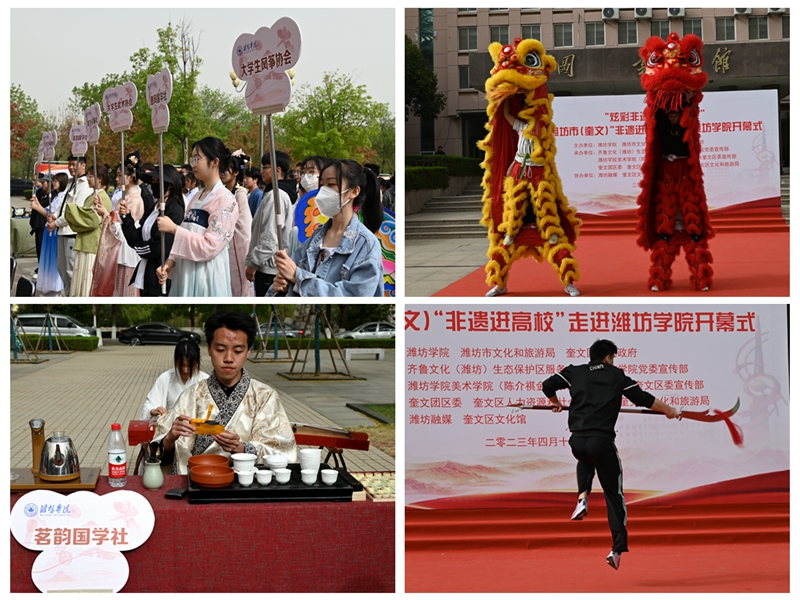 本网讯 为深入贯彻落实党的二十大精神和习近平总书记关于非物质文化遗产保护工作的重要指示精神,弘扬潍坊市优秀传统文化,4月11日下午,“炫彩非遗·薪火相传”潍坊市(奎文)“非遗进高校”走进潍坊学院开幕式在学校图书馆前广场举行。学校党委副书记徐梅,省派第一书记驻潍坊市奎文区工作队、潍坊市文旅系统和奎文区有关领导出席开幕式,学校党委委员、宣传部部长单振涛主持开幕式。 美术学院(陈介祺金石书法学院)班子成员和学校各部门代表、师生代表等300余人参加开幕式。