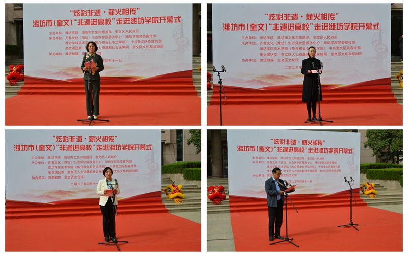 本次活动由潍坊市文化和旅游局、奎文区人民政府和潍坊学院主办,齐鲁文化(潍坊)生态保护区服务中心、潍坊学院党委宣传部、潍坊学院美术学院(陈介祺金石书法学院)、中共奎文区委宣传部、奎文团区委、奎文区人力资源和社会保障局、奎文区文化和旅游局承办,潍坊融媒、奎文区文化馆协办。根据活动安排,炫彩非遗·薪火相传”潍坊市(奎文)“非遗进高校”将在我校组织开展7场公益讲座和培训,组织学生到潍坊非遗聚集区、传承基地、非遗工坊进行研学体验,让广大师生认识优秀传统文化的技艺之美、匠心之美,增强对中华优秀传统文化的理解和认同。