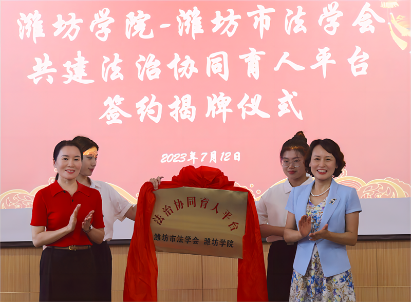 仪式上,政法学院负责人与夏寿岩签订《潍坊学院—潍坊市法学会共建法治协同育人平台合作框架协议》,徐梅与郭璐共同为“潍坊学院—潍坊市法学会法治协同育人平台”揭牌。