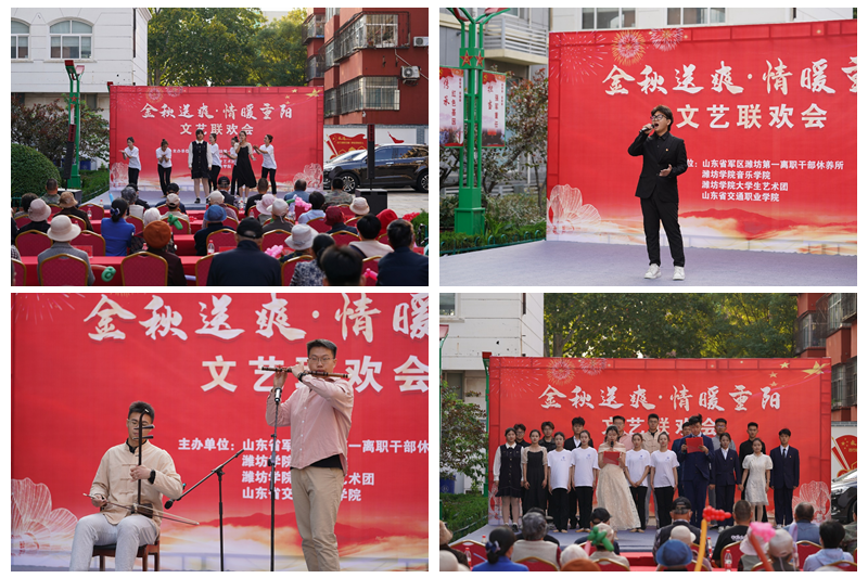 本网讯 为深化共青团实践育人工作,推动“百万大学生进社区”社会实践落地落实,进一步丰富潍坊市军区离职干部的精神文化生活,为离休老干部送上祝福与关怀,10月9日,由山东省军区潍坊第一离职干部休养所主办,校团委、音乐学院承办的“金秋送爽·情暖重阳”文艺联欢会在潍坊第一离职干部休养所举行。潍坊军分区第一离职干部休养所政委井盛以及部分老首长和老领导出席联欢会,我校24名青年志愿者参加本次晚会。