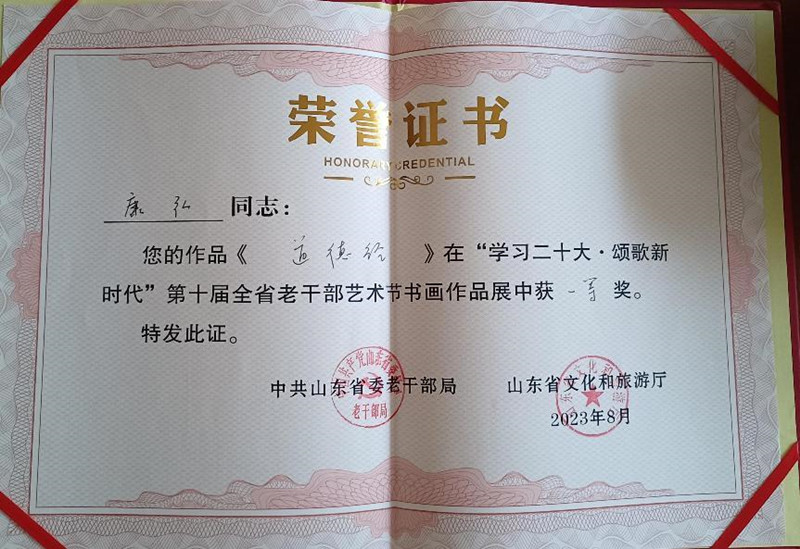 本网讯 近日,“学习党的二十大·颂歌新时代”第十届全省老干部艺术节获奖名单公布,我校康弘老师的作品《道德经(六十四章)》获得书画艺术类一等奖,张松老师的作品《传统中医针灸》获得摄影类优秀奖。