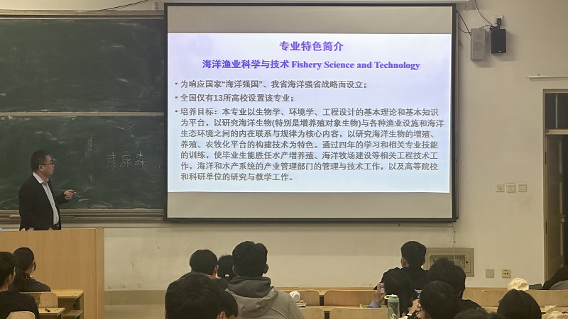 于海瑞从师资队伍、专业简介、科教创新平台与实践基地、就业前景以及期望和要求等五个方面进行了详细介绍。他表示,海洋作为国家的蓝色宝库,蕴藏着丰富的资源,海洋渔业科学与技术专业所研究的领域关乎千家万户,关乎国计民生。同学们要致力于研究开发这些宝藏,为海洋强国、海洋强省战略作出自己的贡献。最后,他希望同学们要在大好年华努力学习专业知识,增强志气、底气、骨气,不负时代、不负韶华、不负青春。