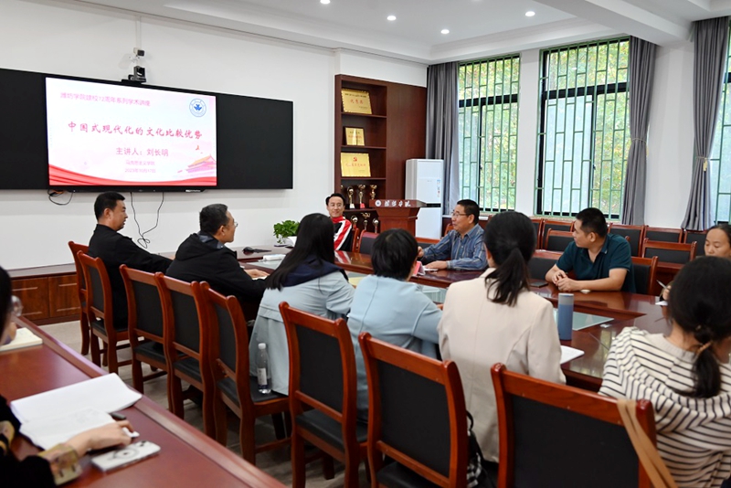 讲座中,刘长明教授以“中国式现代化的文化比较优势”为主题,以中华传统文化为切入点,从民本思想、马克思主义共享思想、协同两个文明等方面论证了中国式现代化的文化比较优势。讲座结束后,学院教师就传统文化相关内容进行了学术交流,最后,刘德才进行讲座总结,对刘教授的学术风范深表敬佩,希望今后学院在学术交流方面得到刘教授更多指导。