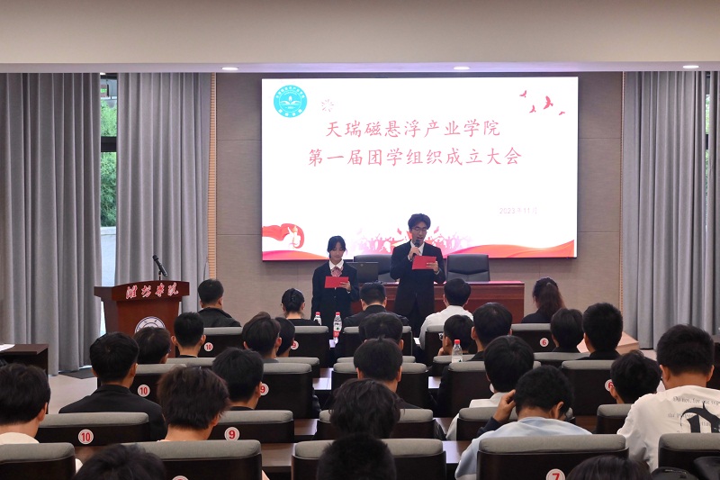 会议公布了天瑞磁悬浮产业学院第一届团学组织成员名单,学院领导为第一届主席团进行了授旗,团学组织代表做就职发言,宣读《学生干部自律公约》,全体成员进行就职宣誓。