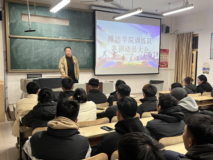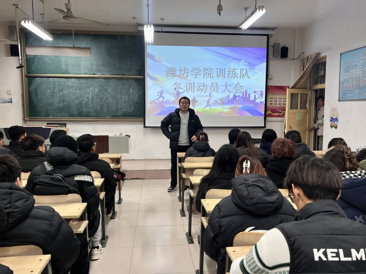 本网讯 为调动队员们的训练热情,凝聚队员们的团结意识,勉励各训练队共同进步,11月14日晚,体育学院召开潍坊学院训练队冬训动员大会。体育学院副院长管培国主持会议,团总支(学生工作办公室)书记(主任)卢永波提出训练要求。训练队全体队员参加会议。