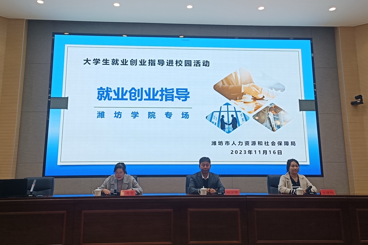 本网讯 11月16日,由潍坊市人力资源和社会保障局主办,潍坊市公共就业和人才服务中心承办的“大学生就业创业指导进校园活动”在我校成功举办。本次宣讲特邀潍坊市公共就业和人才服务中心大中专毕业生服务科副科长王建红、中国石油大学大学生职业生涯教育与就业创业指导团队负责人刘江华教授主讲,学生工作处副处长王秀慧主持,各二级学院学生代表参加。