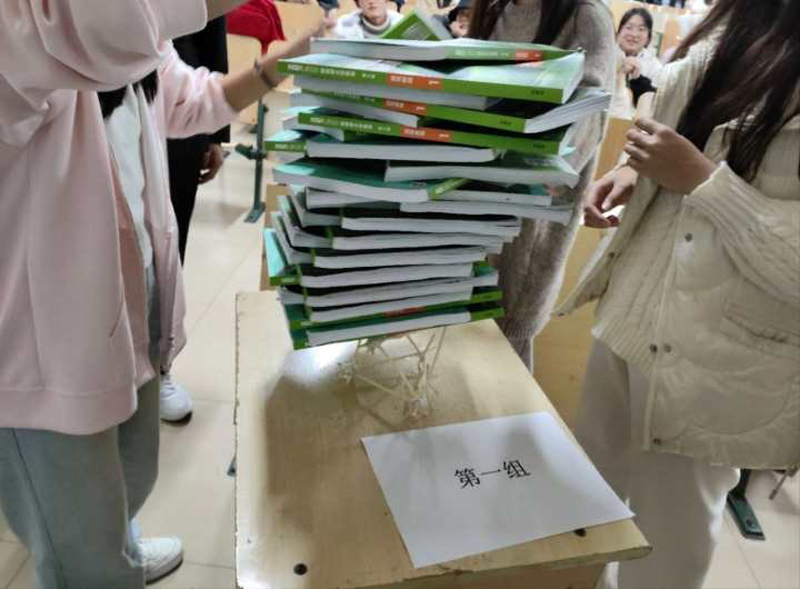 经过60分钟的紧张搭建,各参赛小组的作品陆续完成。计分人员仔细测量了作品的各项数据,包括高度、宽度、重量等,以确保公平公正。“桥梁”承重试验环节,各小组需要在120秒内将尽可能多的书本放置在“桥梁”上。综合评委根据作品美观、承重能力等多方面因素,对参赛的13个小组进行评分。经过激烈角逐,2023级数学与应用数学代表队,凭借出色的创意和扎实的技能获得了本次比赛的冠军。