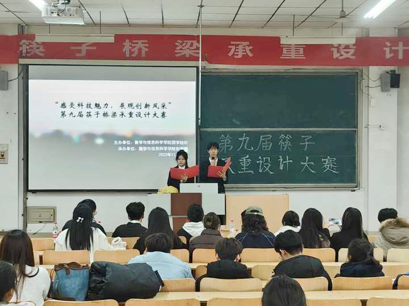 本网讯 为丰富同学们的校园生活,激起同学们对创新的兴趣,数学与信息科学学院于11月19日晚,举办第九届筷子桥梁承重设计大赛。