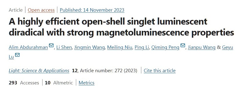 本网讯 近日,我校化学化工与环境工程学院申立博士与吉林大学电子科学与工程学院阿力木副教授、卢革宇教授团队、南京工业大学彭其明教授等研究人员合作,在国际学术期刊Light: Science & Applications上发表了题为“A Highly Efficient Open-shell Singlet Luminescent Diradical with Strong Magnetoluminescence Properties”的文章,报道了一种具有高发光效率和稳定性的开壳单线态双自由基DR1。研究表明,DR1分子显示出很强的单分子磁致发光(ML)特性,在7 T的磁场下,实现了210%的极高ML值,显示出DR1分子在光电子和磁光学方面的巨大应用潜力。