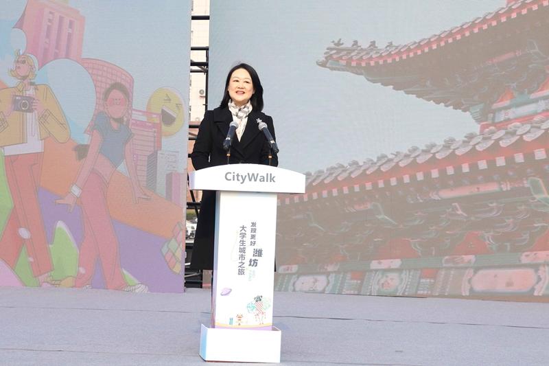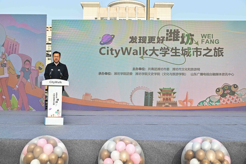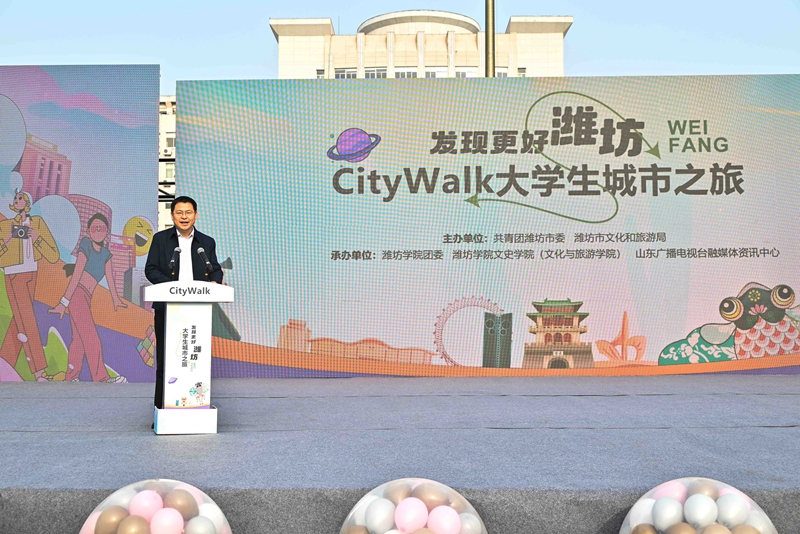 本网讯 12月9日上午,“发现更好潍坊”Citywalk大学生城市之旅活动启动仪式在我校举行。本次活动由共青团潍坊市委、潍坊市文化和旅游局主办,潍坊学院团委、潍坊学院文史学院(文化与旅游学院)、山东广播电视台融媒体资讯中心承办。学校党委委员、副校长任立春,潍坊市文化和旅游局党组书记、局长权文松,潍坊团市委统战部部长段玲梅,潍坊市旅游行业协会副会长李树青等出席,学校团委、文史学院相关负责同志,各学院团总支书记(副书记)和学生代表500余人参加。