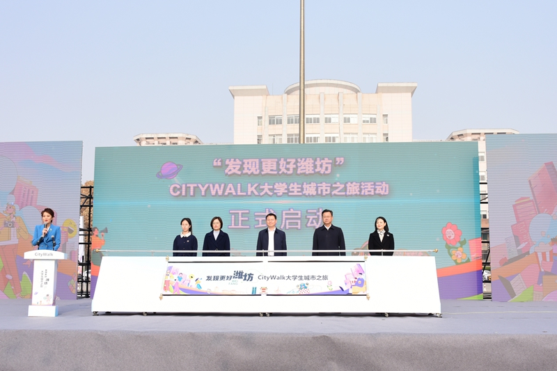 领导嘉宾与学生代表共同推动启动杆,“发现更好潍坊”CityWalk大学生城市之旅活动正式启动。
