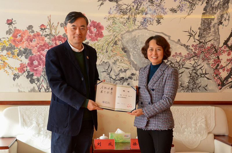 会前,校党委书记徐梅会见刘成教授并颁发潍坊学院客座教授证书,党委委员、副校长苗金春参加会见。