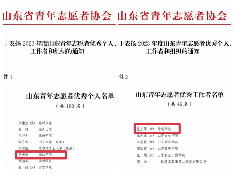 本网讯 为表扬先进、鼓舞斗志,发挥先进典型示范引领作用,激励和引导广大青年志愿者弘扬志愿精神,勇担时代使命,12月29日,山东省青年志愿者协会发布《关于表扬2023年度山东青年志愿者优秀个人、工作者和组织的通知》,我校建筑工程学院马俊原被评为山东青年志愿者优秀个人,团委张亚萍被评为山东青年志愿者优秀工作者。