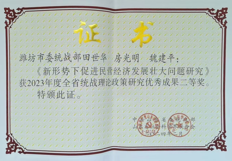 本网讯 近日,全省统战部长会议通报了2023年度全省统战理论政策研究优秀成果,致公党潍坊学院主委、经济管理学院教授魏建平撰写的《新形势下促进民营经济发展壮大问题研究》课题论文被省委统战部、省社会科学界联合会评为2023年度全省统战理论政策研究优秀成果二等奖。