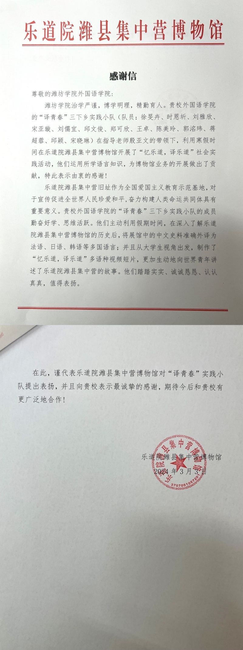本网讯 开学第一周,学校外国语学院收到一封来自乐道院·潍县集中营博物馆的感谢信,他们对“译青春”三下乡实践小队成员在寒假期间向世界传播乐道院文化做出的贡献致以诚挚的感谢。