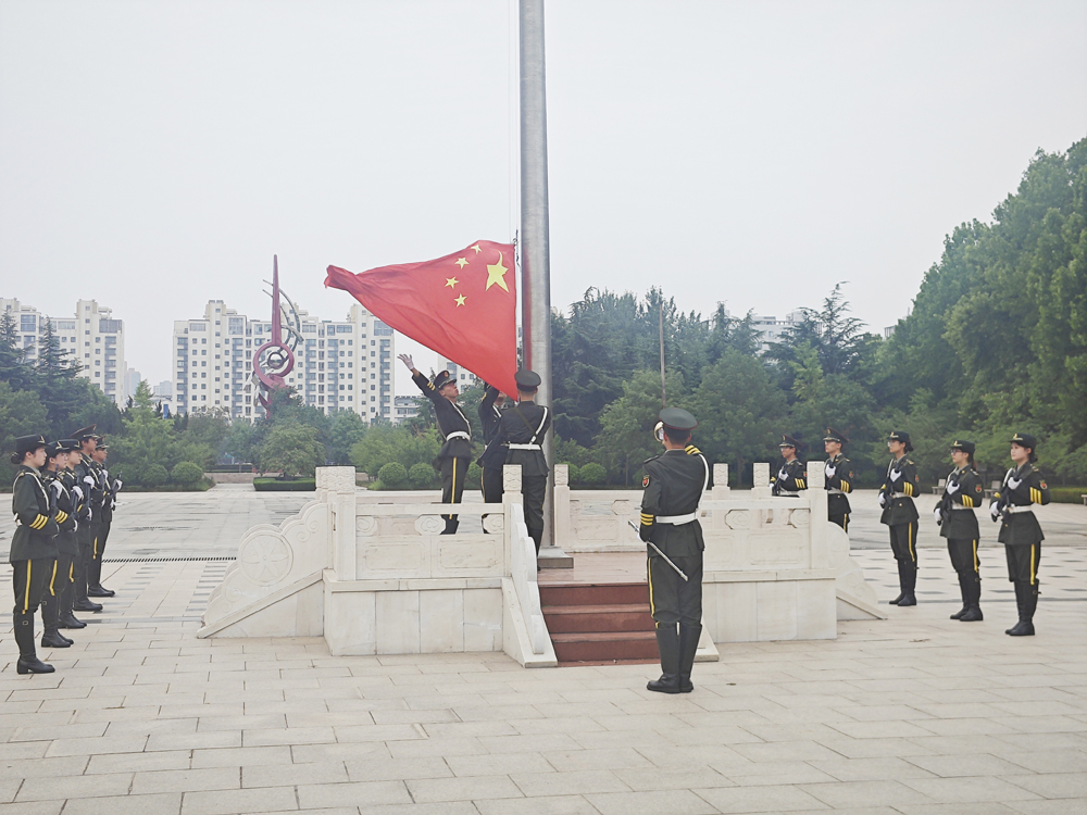 升旗仪式上,国旗护卫队迈着铿锵有力的步伐,手捧鲜艳的五星红旗,英姿飒爽地走向升旗台。随着庄严的国歌奏响,五星红旗冉冉升起,全体师生肃然起敬,面向国旗行注目礼,深怀对祖国无限的热爱和崇高的敬意。