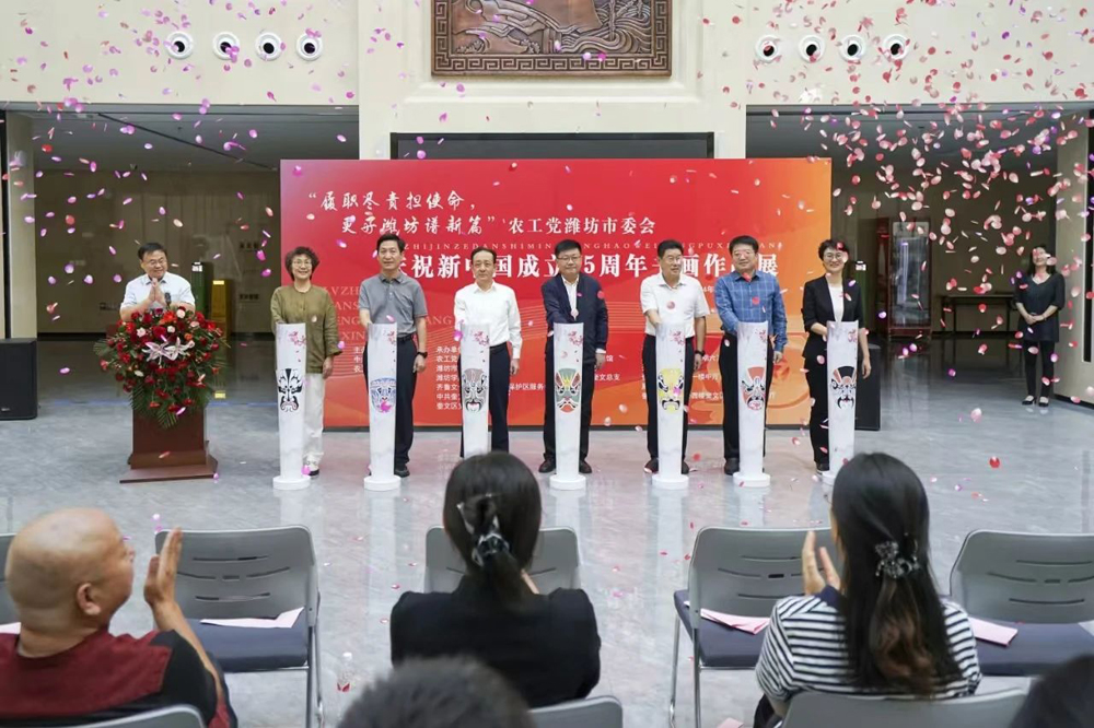农工党潍坊市委会主委刘棣俭主持开幕式。山东省政协副秘书长、农工党省委会专职副主委兼秘书长付军,潍坊市委统战部副部长郝信富出席并致辞。奎文区委区政府、农工党潍坊市委会,潍坊市美术家协会等单位有关领导和同志,社会各界书画爱好者等100余人参加。