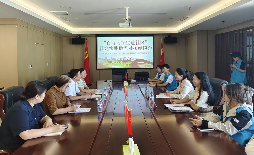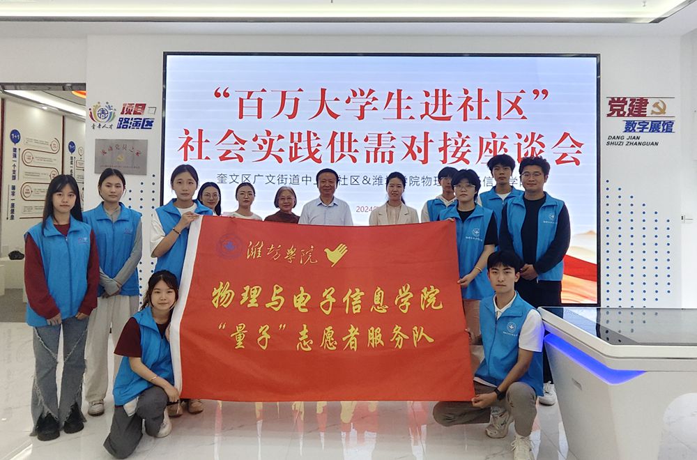 本网讯 为进一步推动“百万大学生进社区”社会实践活动开展,近日,我校物理与电子信息学院与潍坊市广文街道中上虞社区开展社会实践供需对接座谈会。