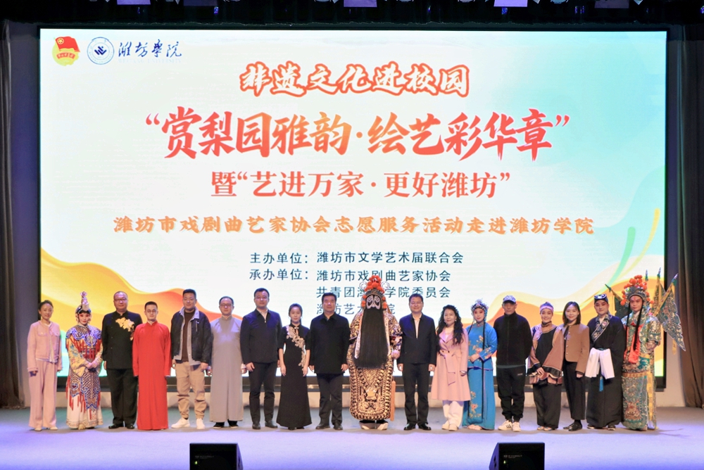 本网讯 10月27日,非遗文化进校园“赏梨园雅韵·绘艺彩华章”暨“艺进万家·更好潍坊”潍坊市戏剧曲艺家协会志愿服务活动在学校图书馆报告厅举行。学校党委委员、副校长任立春,潍坊市文联党组成员、副主席邱兆锋,潍坊市戏剧曲艺家协会主席刘淑娟,潍坊艺术剧院总经理富荣,潍坊市戏剧曲艺家协会副主席李全忠、张华出席活动。