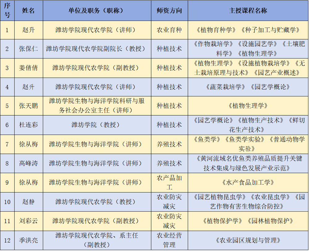 本网讯 近日,潍坊市农业农村局公布了潍坊市高素质农民培育讲师名单。我校赵升等10名教师成功入选,涵盖农业育种、种植技术等多个师资方向。此次评选旨在进一步加强高素质农民培育师资队伍建设,切实提升我市农民培育质效。