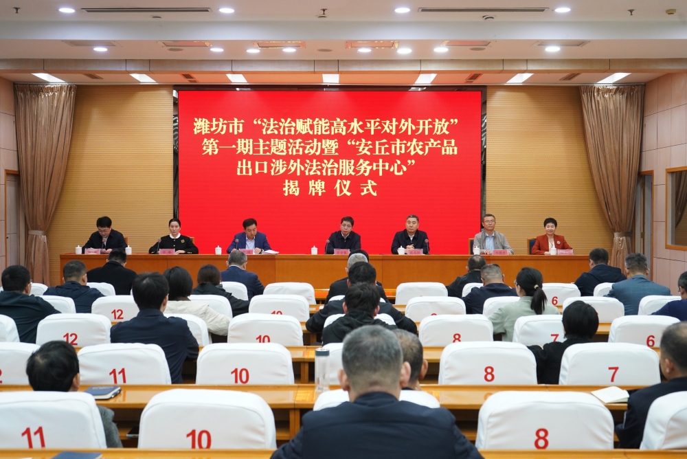 本网讯 11月7日,潍坊市“法治赋能高水平对外开放”第一期主题活动在安丘举办。学校党委委员、副校长苗金春,安丘市委副书记、市政府党组书记谭明,潍坊市司法局党委书记、局长张志强,潍坊市委政法委副书记郭璐出席活动并致辞。安丘市委常委、政法委书记刘鑫主持活动。
