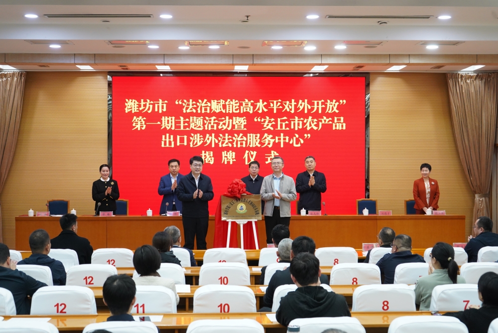 学校法学院负责同志与刘鑫为“潍坊学院(安丘)涉外法治人才协同培养基地”揭牌。活动还举行了“安丘市农产品出口涉外法治服务中心”揭牌仪式,为安丘市涉外法治服务团成员及外聘专家代表颁发聘书,并组织专家围绕农产品出口企业法律风险防范开展专题授课。