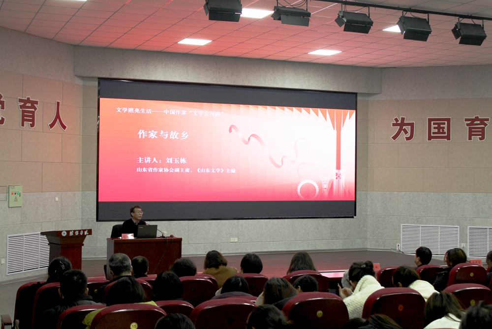 本网讯 11月27日,“文学照亮生活”——中国作家“文学公开课”在学校举行。学校党委委员、副校长李英德,山东省作家协会副主席、《山东文学》主编刘玉栋,潍坊市文联党组成员、副主席邓光著,潍坊市文联组织联络部主任黎斌出席活动。