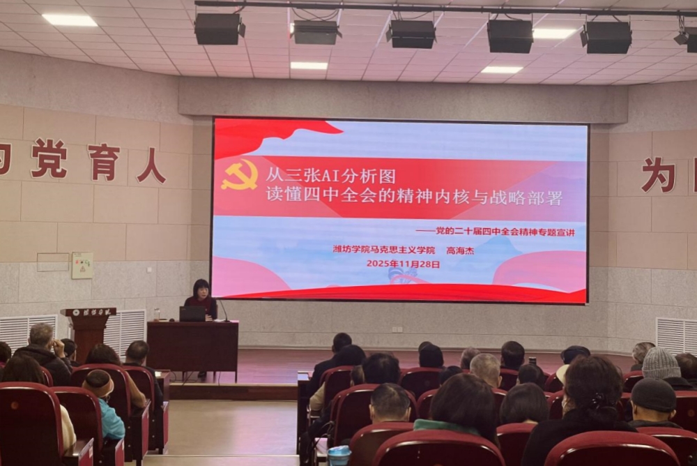 马克思主义学院副院长、副教授高海杰以《从三张AI分析图读懂党的二十届四中全会的精神内核与战略部署》为题作宣讲报告,从把握“十五五”时期的任务书、认清“中国之治”的底气源、理解系统谋划的方法论三个方面,以全新的视角解读党的二十届四中全会精神,将宏大的全会精神转化为具象化、可视化的内容,有效提升了学习效果。