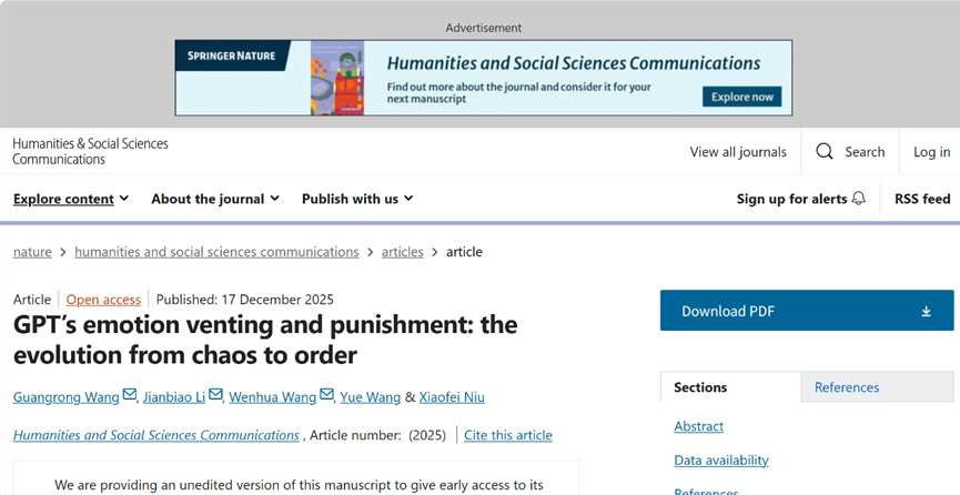本网讯  近日,我校经济管理学院王光荣教授团队研究成果“GPT’s emotion venting and punishment: the evolution from chaos to order”在Humanities & Social Sciences Communications(HSSC)上发表,标志着我校在人工智能与行为科学交叉领域的创新研究取得了重要突破。该成果由我校王光荣教授、南开大学李建标教授、山东大学王文华博士后、王粤博士和牛晓飞教授合作完成。