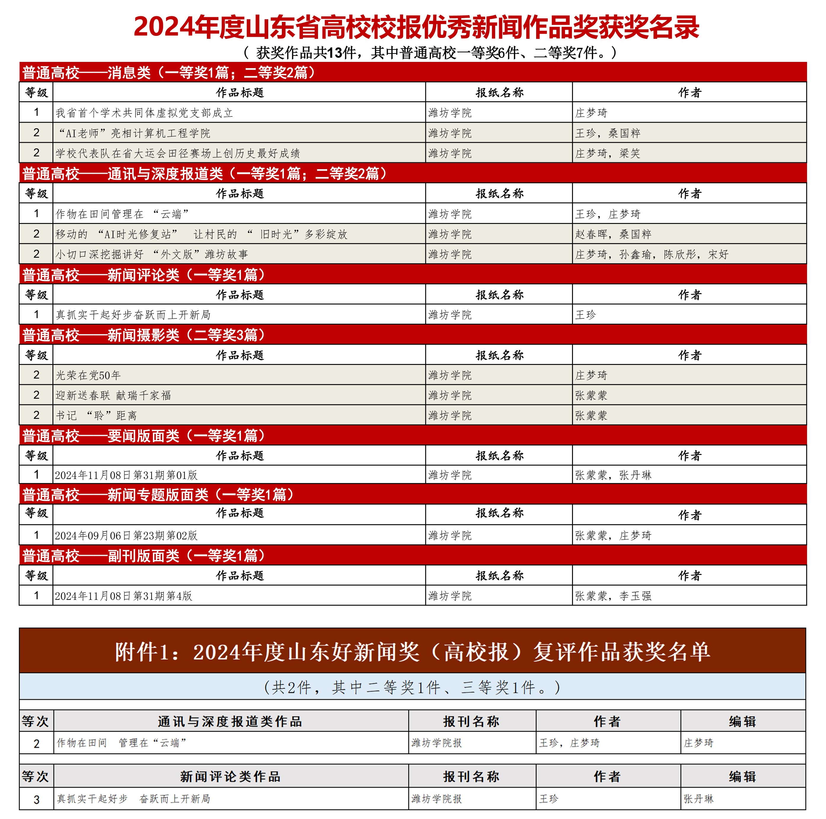 本网讯 近日,2024年度山东省高校校报优秀新闻作品奖评选结果揭晓,学校申报的13件作品获奖,获奖作品涵盖了消息、通讯与深度报道、新闻评论、新闻摄影、版面、新媒体等类别,其中一等奖6项、二等奖7项。同时,通讯与深度报道类作品《作物在田间 管理在“云端”》获2024年度山东省新闻奖(高校报)复评作品奖二等奖,新闻评论类作品《真抓实干起好步 奋跃而上开新局》获三等奖。