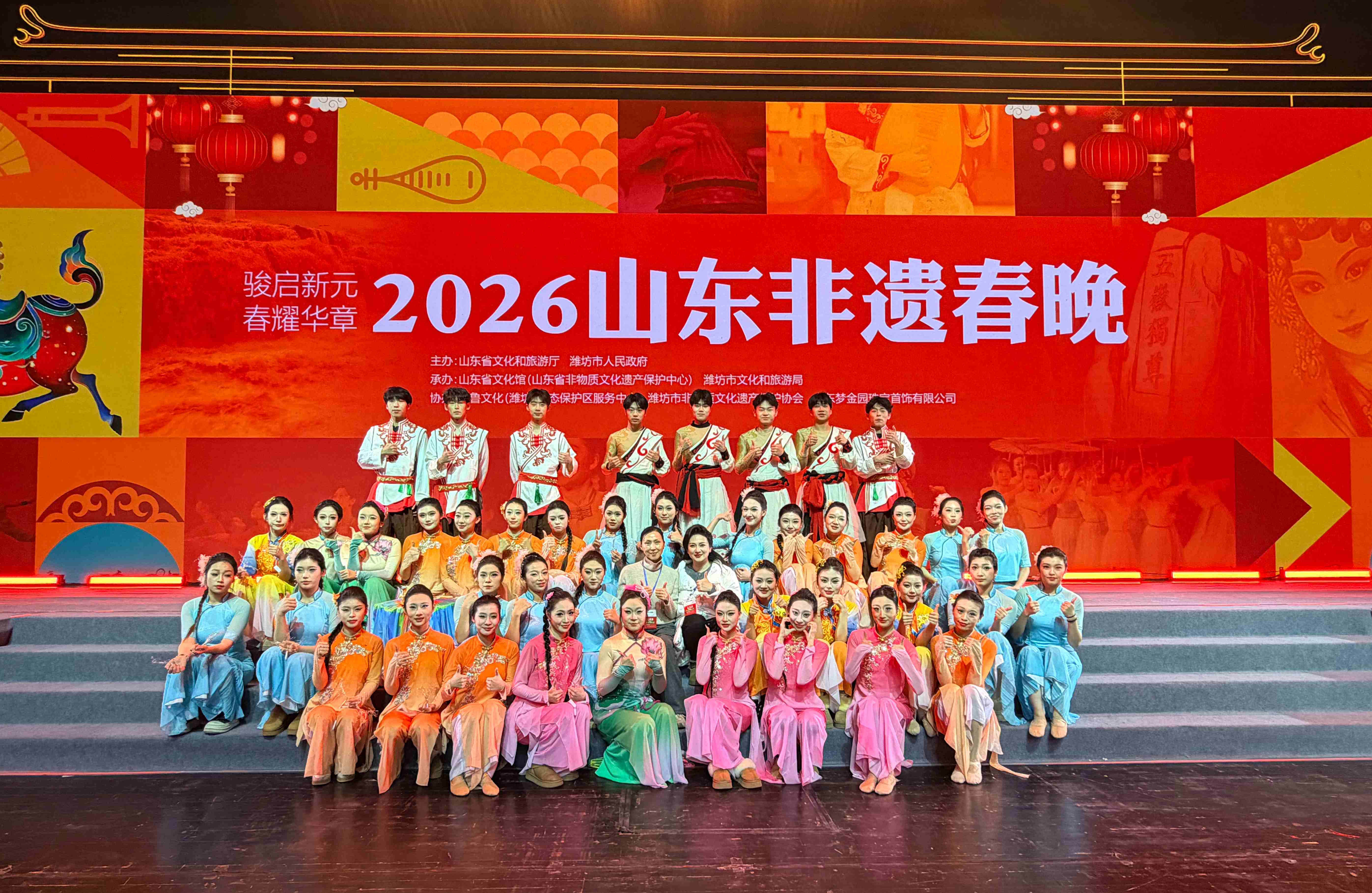本网讯 1月30日晚,2026山东非遗春晚在潍坊大剧院上演。学校音乐与舞蹈学院师生参与此次晚会的多个节目演出与编导工作,以专业表现力为晚会注入鲜明的青春动能。