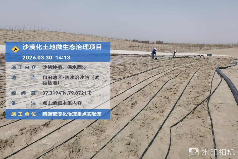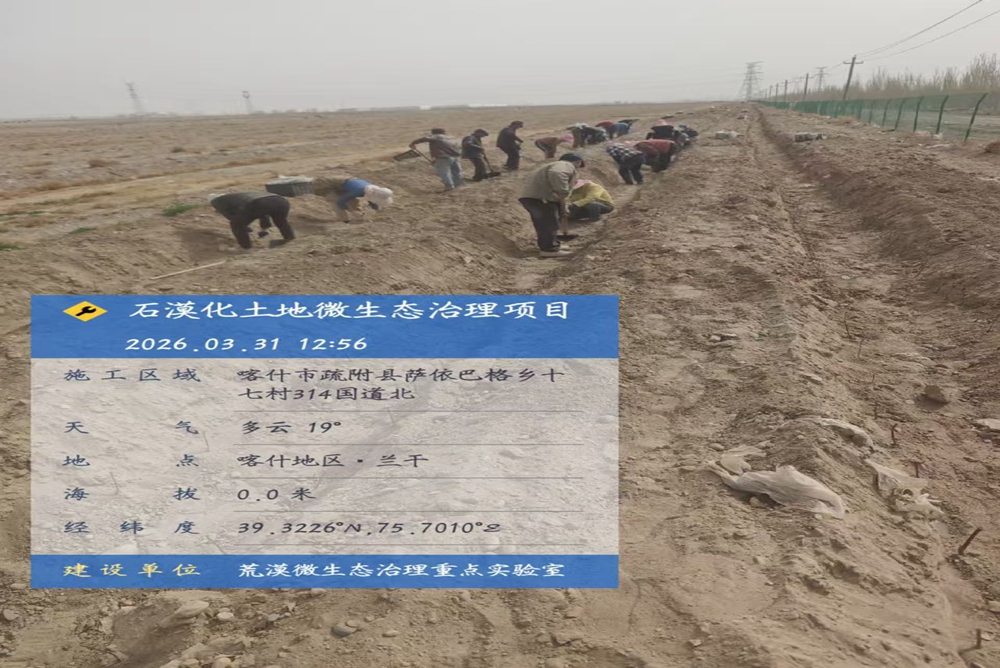 新春谋新局,实干启新程。新疆荒漠微生态治理重点实验室严希海教授团队以“与季节赛跑,起步即冲刺”的姿态,春节前便启动抗旱耐盐优质种质资源筛选、微生态制剂配方深度研发及产业化配方验证等核心工作。节后迅速推进采购、生产复配等工作,自2026年3月上旬起,累计行程13000余公里,动用劳务500余人次,在新疆库尔勒、喀什、和田等五个试验点进行微观生态环境改善治理体系+适生品种”试验种植。在自治区沙漠治理试验站开展防风固沙、沙化土地防渗水透肥,保水释水机理研究与现场试验,治理后微观生态环境抗风蚀、地表防蒸发与叶面防蒸腾技术研究与长期数据监测,同步开展与国内其他高校科研院所进行对比治理试验。对荒漠化、石漠化、盐碱土地、沙化土地多地形地貌进行微生态治理试验,选用3种以上抗旱耐盐适生品种,历经二十余天奋战,全部现场试验任务圆满完成,进入日常管护与数据收集整理中试阶段。