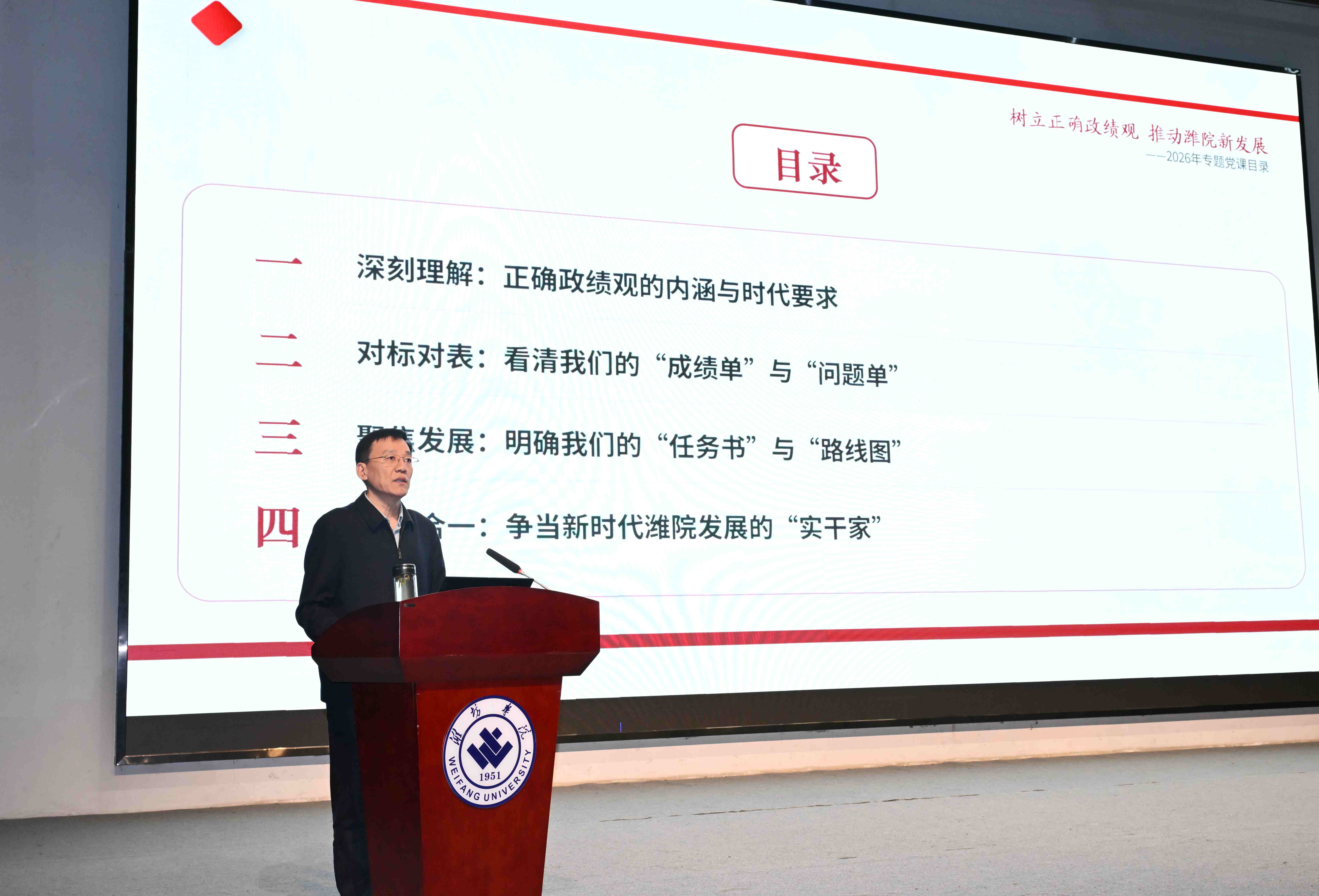 来逢波强调,树立和践行正确政绩观,是把握办学方向、筑牢思想根基的必然要求。要主动对标对表,看清学校当前的“成绩单”与“问题单”;持续聚焦发展,明确学校发展的“任务书”与“路线图”;坚持知行合一,争当新时代潍院发展的“实干家”,将正确的政绩观内化于心、外化于行,以“功成不必在我”的境界和“功成必定有我”的担当谱写学校高质量发展新篇章。