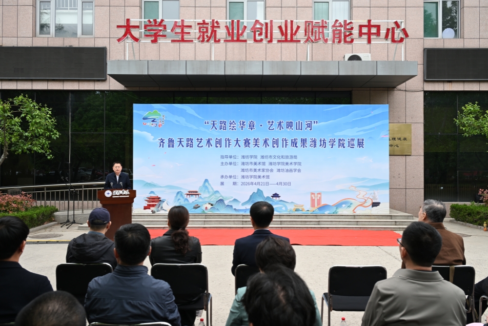 本网讯    4月21日,“天路绘华章・艺术映山河”齐鲁天路艺术创作大赛美术创作成果展潍坊学院巡展暨大学生科技文化艺术节齐鲁天路诗词大赛开幕式在学校举行。学校党委委员、副校长任立春出席并致辞。学校党委委员、宣传部部长张晓静,潍坊市文化和旅游局、潍坊市美术馆、潍坊油画学会、潍坊市美术家协会等单位嘉宾出席开幕式。