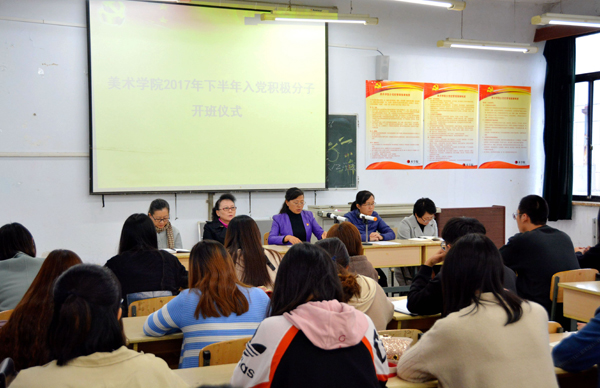 本网讯 10月25日下午,美术学院在1501分党校教室举行2017年下半年入党积极分子培训班开班仪式,学院党总支书记于建华、副书记刘雪梅、学生党支部书记、全体辅导员、学生党员及39名学员参加了开班仪式。