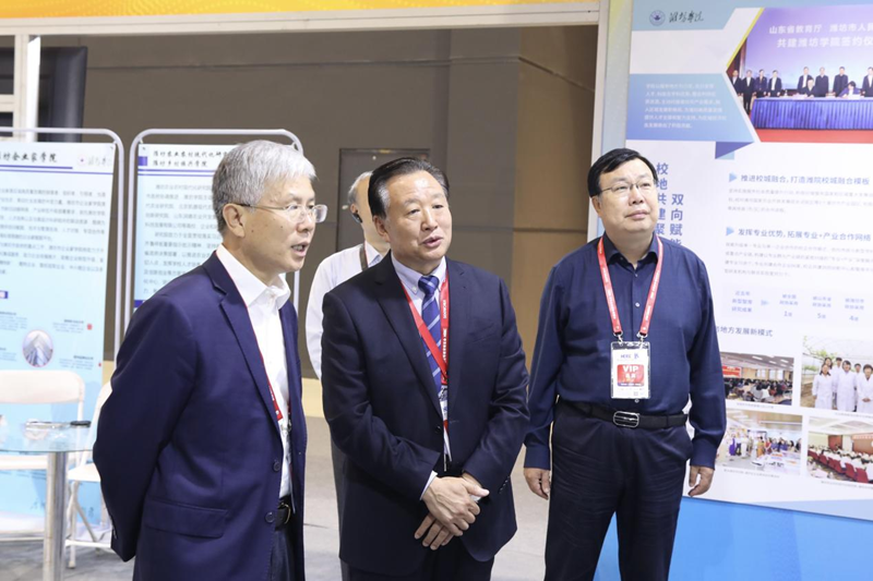 展会期间,第二十届中央候补委员、中国工程院院士、山东大学校长李术才,山东省高等教育学会会长罗公利莅临我校展位指导,肯定了我校纵深推进科教产融合创新、建设高水平应用型大学的做法。