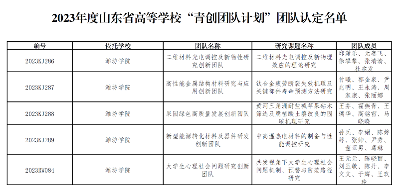 本网讯    近日,省教育厅公布《2023年度山东省高校“青创团队计划”团队认定名单》,我校5个团队获批山东省高等学校优秀青年创新团队。