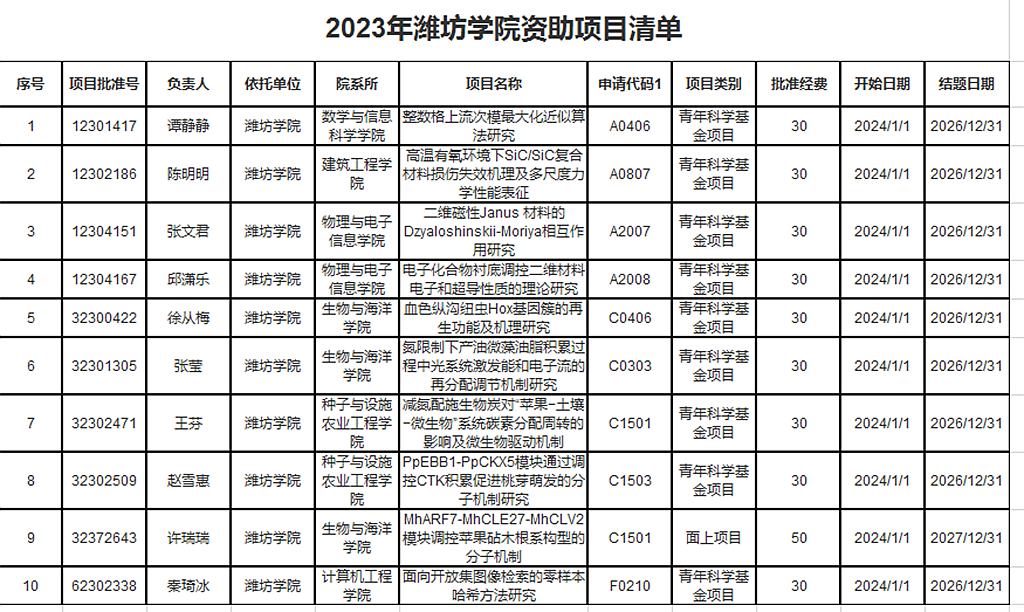 8月24日,国家自然科学基金委员会公布2023年度国家自然科学基金项目评审结果,我校10个项目获批,直接经费320万元,项目立项数首次突破两位数,立项数及立项经费数均创历史新高。2023年,学校在有组织科研上狠下功夫,除获批10项国家自然科学基金外,学校还获批国家社科基金一般项目1项,国家艺术基金1项;获批山东省自然科学基金资助项目33项,立项数创历史新高;获省科学技术进步奖二等奖1项,省社会科学优秀成果奖二等奖和三等奖各1项;在计算数学、国际环境与能源等领域国际顶级期刊发表论文近10篇;“智能物联与大数据山东省工程研究中心”“绿色催化新材料与光化学转化山东省工程研究中心”获批认定为山东省工程研究中心。