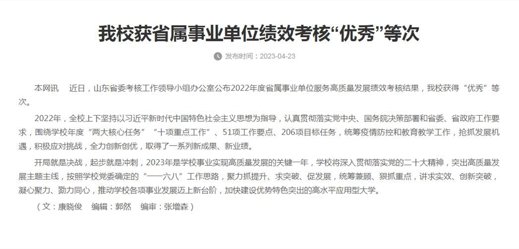 4月13日,省委考核工作领导小组办公室公布2022年度省属本科高校高质量发展绩效考核结果,我校荣获“优秀”等次。这是我校首次获得“优秀”等次。