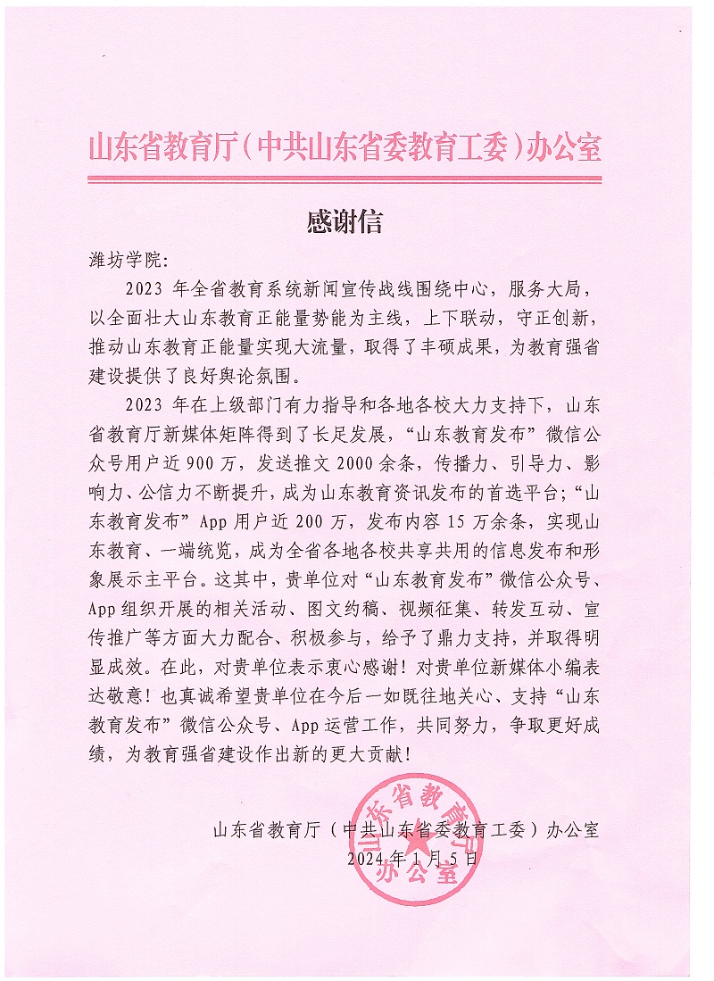 信中指出,潍坊学院对“山东教育发布”微信公众号、APP组织开展的相关活动、图文约稿、视频征集、转发互动、宣传推广等方面大力配合、积极参与,给予了鼎力支持,并取得明显成效。