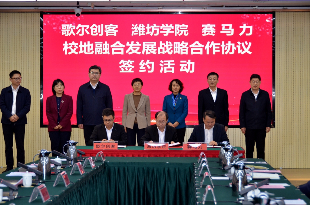 在签约仪式上,来逢波与张帅分别代表校地双方签署校地融合发展战略合作协议。李英德与山东赛马力发电设备有限公司、歌尔创客(潍坊)数字创意科技有限公司负责人签署校企共建合作协议。