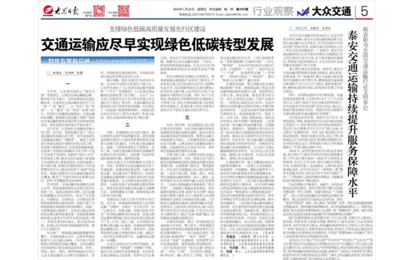 1月28日,《大众日报》5版刊发校长来逢波专题文章《交通运输应尽早实现绿色低碳转型发展》。文章从全省绿色交通运输体系在绿色交通基础设施建设、交通运输结构调整、新能源交通运输工具推广和绿色交通运输制度体系建设等方面取得明显成效,全省交通运输实现绿色低碳转型发展面临着一些亟待突破的瓶颈性问题、障碍性因素,以及未来交通强国山东示范区建设的实施路径等方面进行了深入阐述。