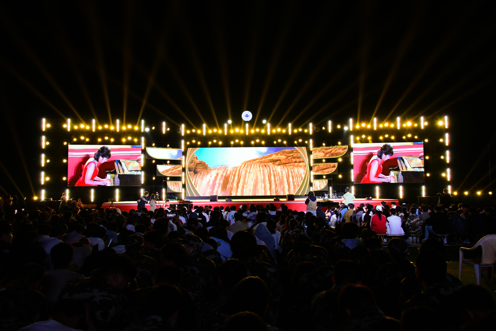 本网讯 金秋送爽同庆盛世中华,硕果飘香谱写潍院华章。9月23日晚,庆祝新中国成立75周年暨2024年迎新文艺演出在学校体育场举行。学校党委书记徐梅,党委副书记王守全,党委委员赵卫红、任立春、武玉杰、赵加强以及相关职能部门、各二级学院负责同志与2024级新生欢聚一堂,现场观看演出。文艺演出通过学校官方视频号同步直播,近5万人次云端相聚共享视听盛会,同庆祖国华诞。