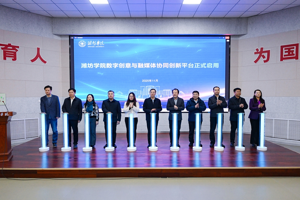 仪式上,来逢波代表学校对各位来宾、媒体记者表示欢迎,并介绍了学校在学科建设、人才培养、师资队伍、科研创新和社会服务等方面取得的成果。他表示,数字创意与融媒体协同创新平台的启用,是学校落实媒体融合发展要求、提升传播能力、强化育人功能的战略举措,将聚焦育人初心、融合创新、实践赋能三大核心使命,构建具有潍院特色的全媒体传播体系,打造校媒合作、产教融合的高水平实践基地。学校将以此为契机,推动宣传工作从“信息传递”向“价值引领”跃升,从“单点发声”向“系统传播”转型,从“内容生产”向“生态构建”迈进,努力让潍院故事传得更远、潍院声音更加响亮、潍院形象更加鲜明。